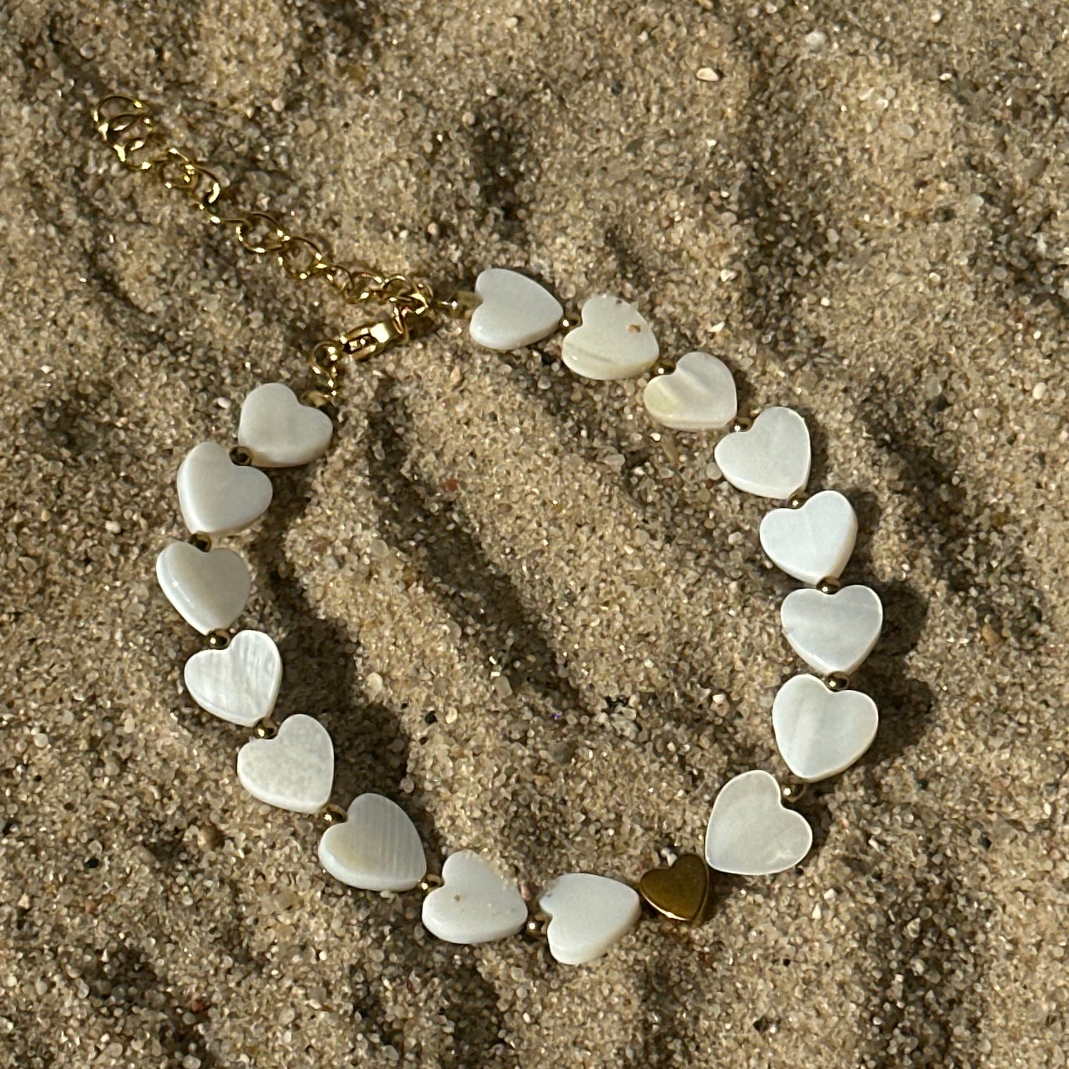 Bransoletka wykonana z drobnych serduszek z masy perłowej, z ciemniejszym, hematytowym sercem w centrum.