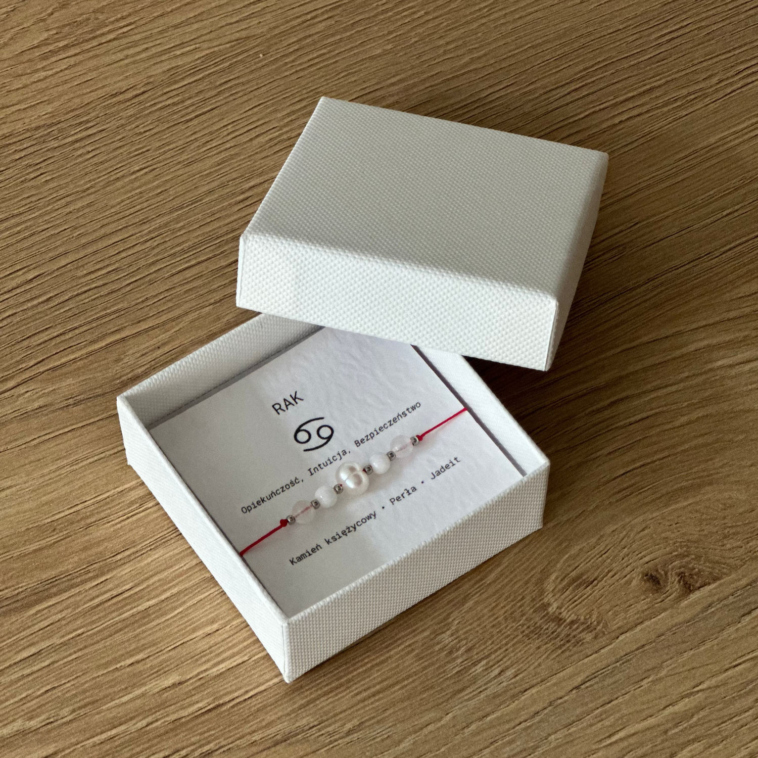 Bransoletka z naturalnych kamieni – kamienia księżycowego, perły i jadeitu – stworzona dla wrażliwych i intuicyjnych Raków. Harmonizuje emocje, wzmacnia duchową mądrość i chroni przed lękami. Idealny talizman dla tych, którzy pragną wewnętrznego spokoju i emocjonalnej równowagi.