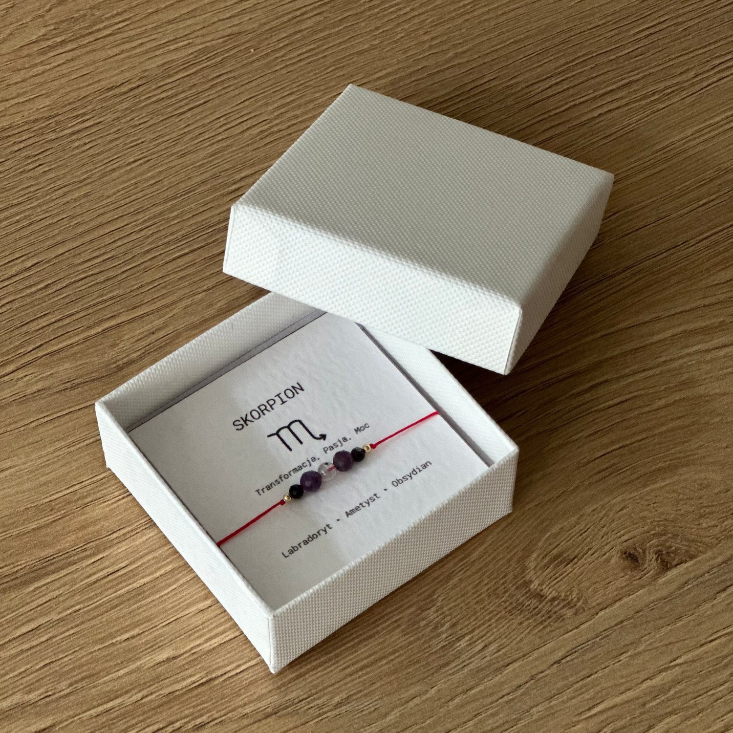 Bransoletka z naturalnych kamieni – labradorytu, ametystu i obsydianu – stworzona dla intensywnych i pełnych pasji Skorpionów. Wzmacnia intuicję, oczyszcza energię i chroni przed negatywnością. Idealny talizman dla tych, którzy przechodzą transformację i pragną głębokiego rozwoju duchowego.