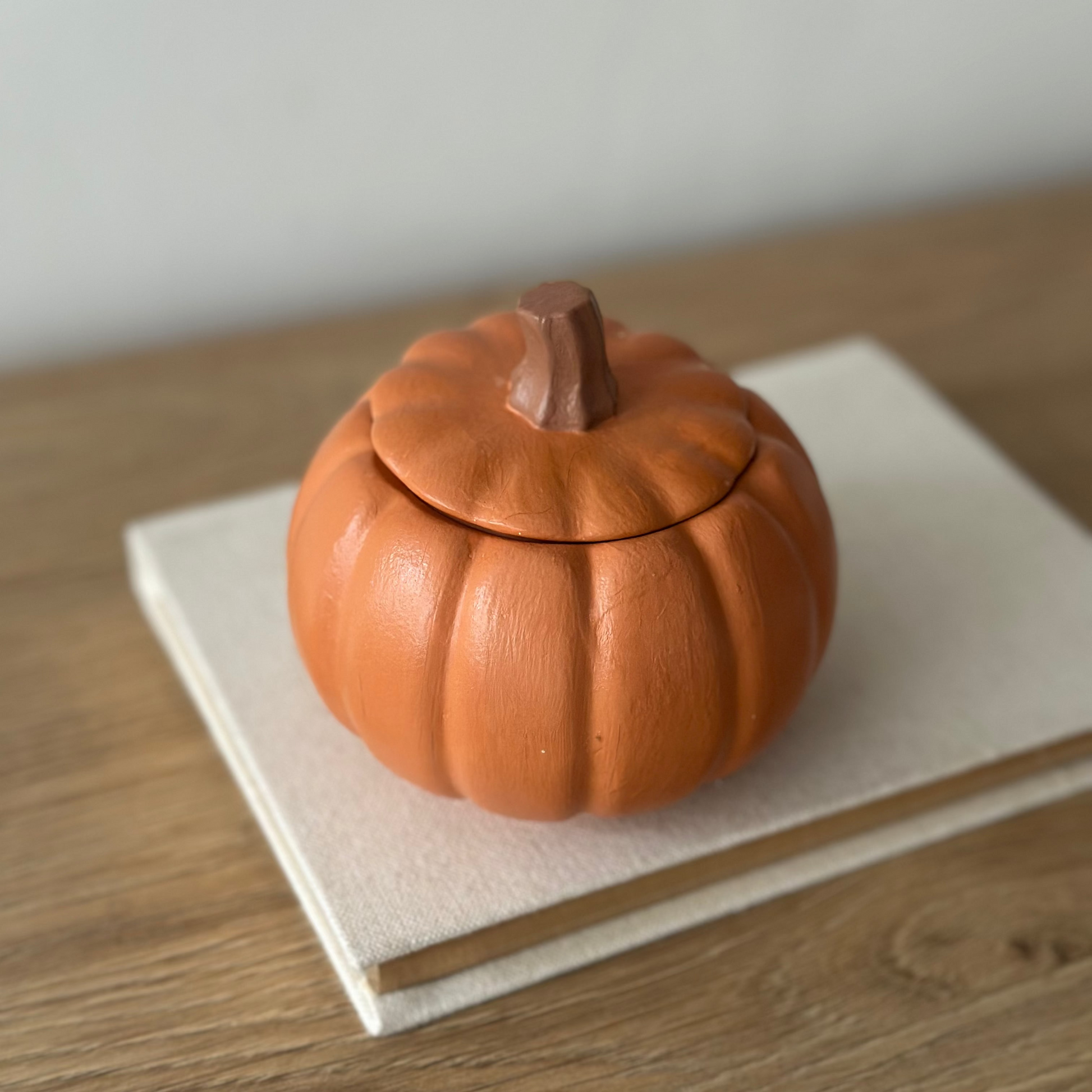Duża świeca sojowa w gipsowym pojemniku w kształcie dyni. Efektowna dekoracja i źródło nastrojowego światła, idealne na jesień.