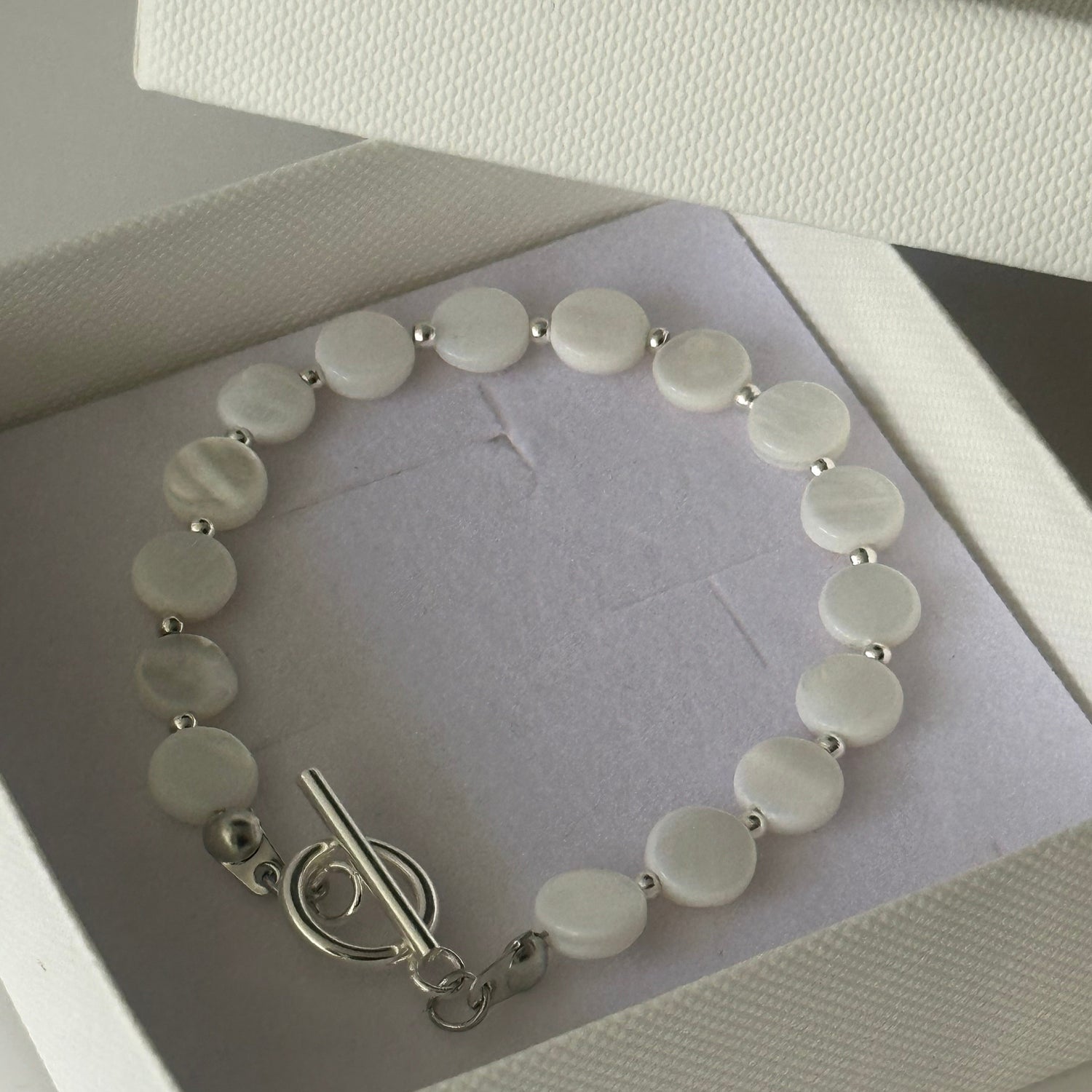 Bransoletka z masy perłowej z eleganckim zapięciem toggle, które dodaje jej wyjątkowego charakteru. Subtelny blask i ponadczasowa elegancja w jednym.