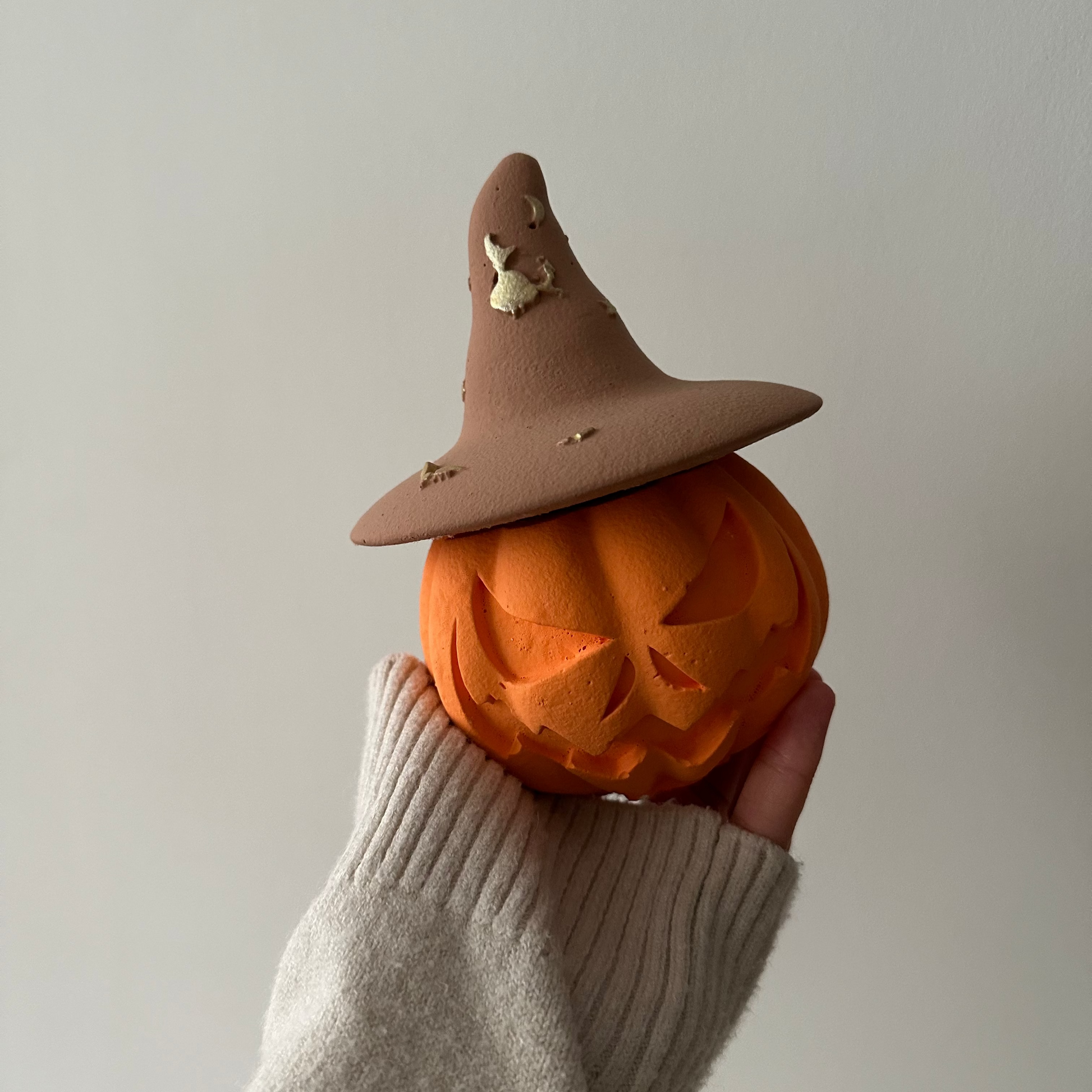 Świeca sojowa w gipsowym pojemniku w kształcie dyni. Idealna na Halloween – efektowna dekoracja i nastrojowe światło w jednym.