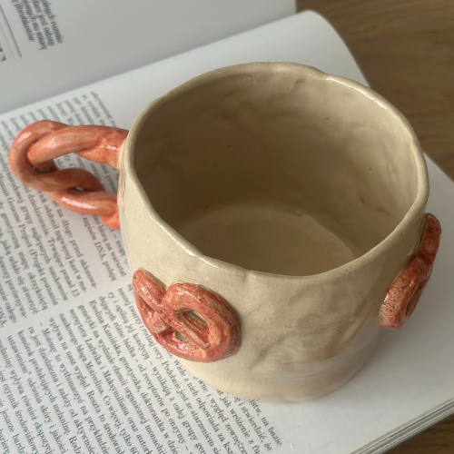 Wyjątkowy ręcznie robiony kubek, ozdobiony trójwymiarowymi preclami, które wyglądają jak prawdziwe! Jego oryginalny design przyciąga wzrok i sprawia, że każda kawa czy herbata smakuje jeszcze lepiej. To idealny wybór dla miłośników niebanalnej ceramiki i wypieków!