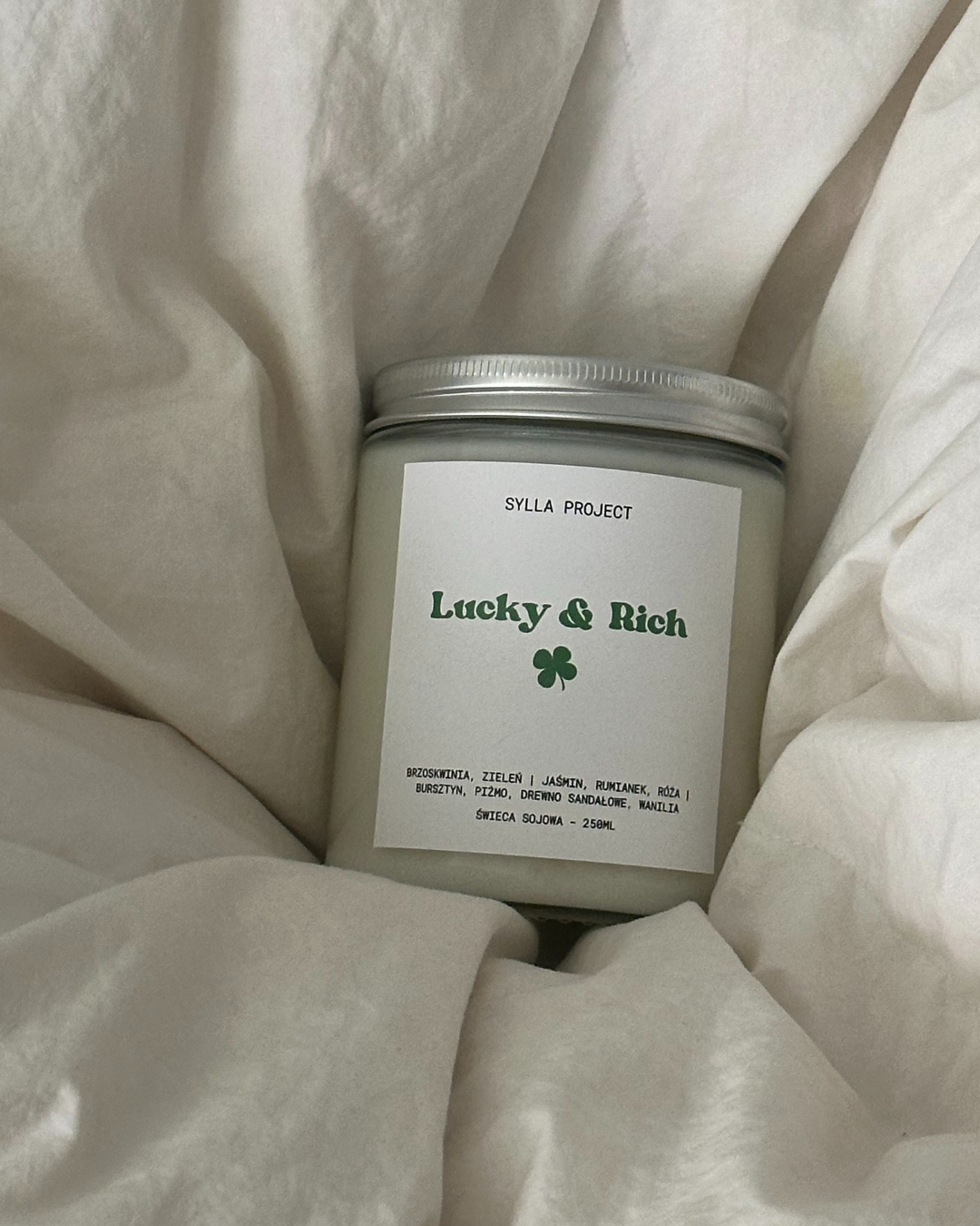 Przestrzeń pełna wewnętrznej harmonii i spokoju. Lucky & Rich to świeca sojowa, która pozwala poczuć się jak najlepsza wersja siebie, otulając Cię poczuciem spełnienia i szczęścia. Każdy moment spędzony w towarzystwie tej świecy przypomina, że zasługujesz na wszystko, co najlepsze, a prawdziwe bogactwo tkwi w drobnych przyjemnościach życia.