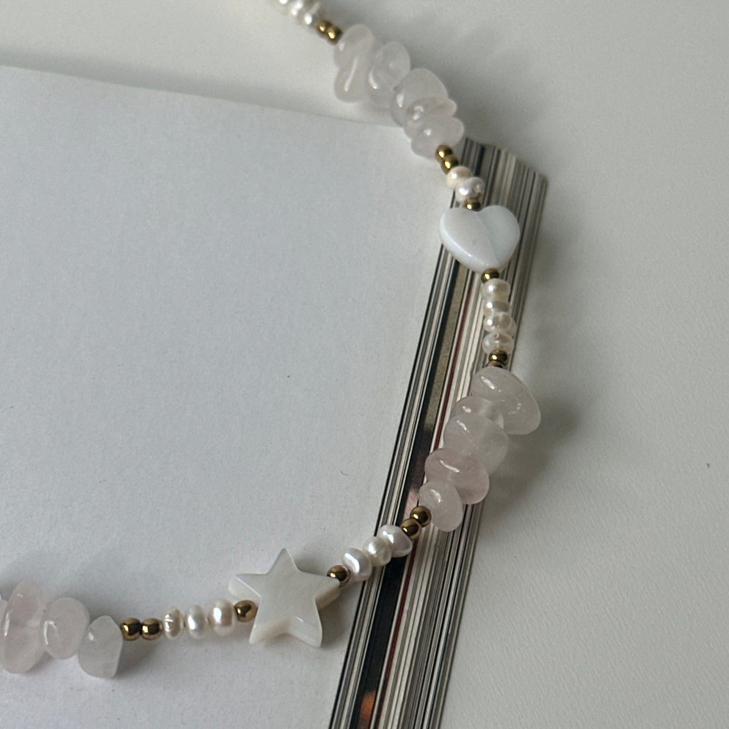 Naszyjnik Rose Crystal łączy ciepło różowego kwarcu z subtelnością pereł, hematytem i masą perłową, tworząc elegancką i delikatną biżuterię pełną harmonii.