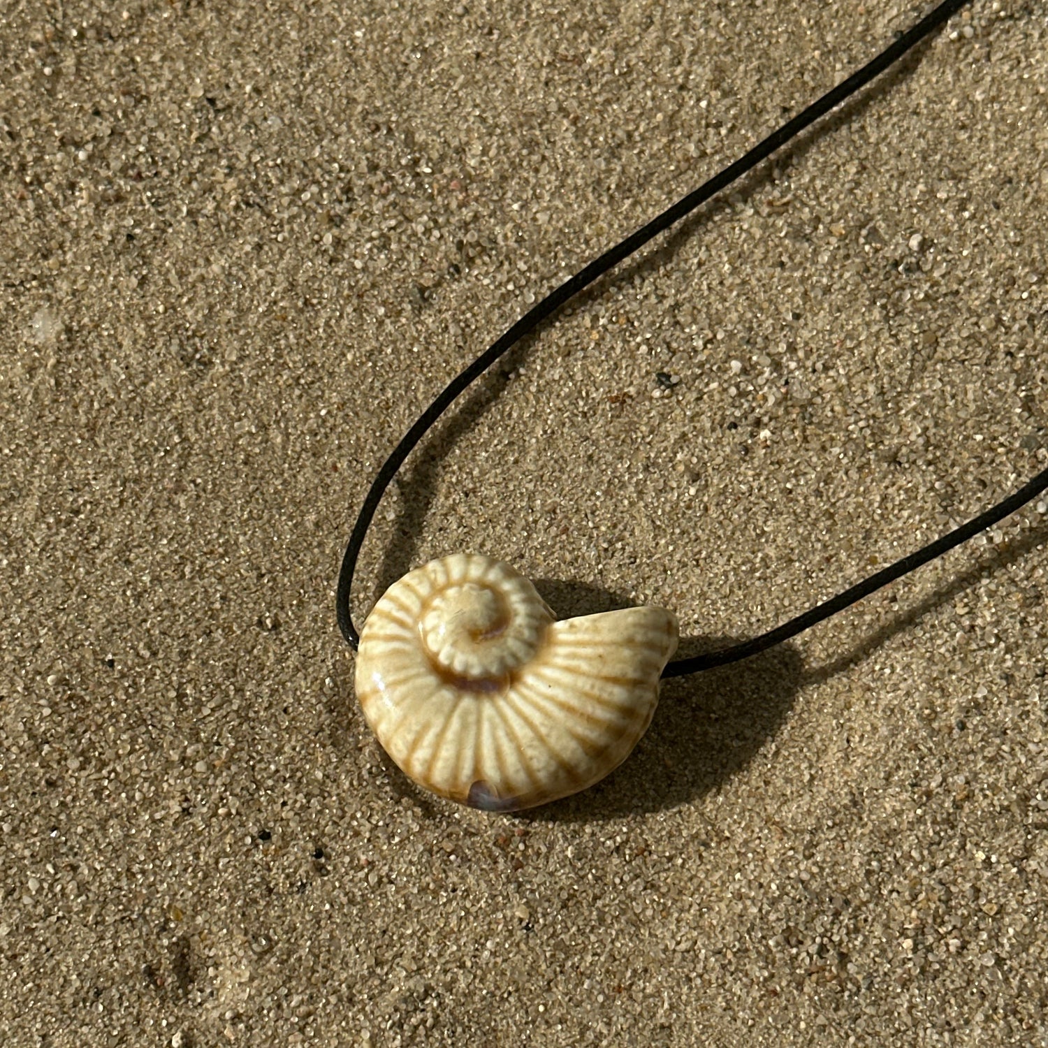 Delikatny naszyjnik z ceramiczną muszlą w ciepłym, piaskowym odcieniu. Każdy egzemplarz jest unikatowy – jak drobny skarb odnaleziony na rozgrzanej słońcem plaży.