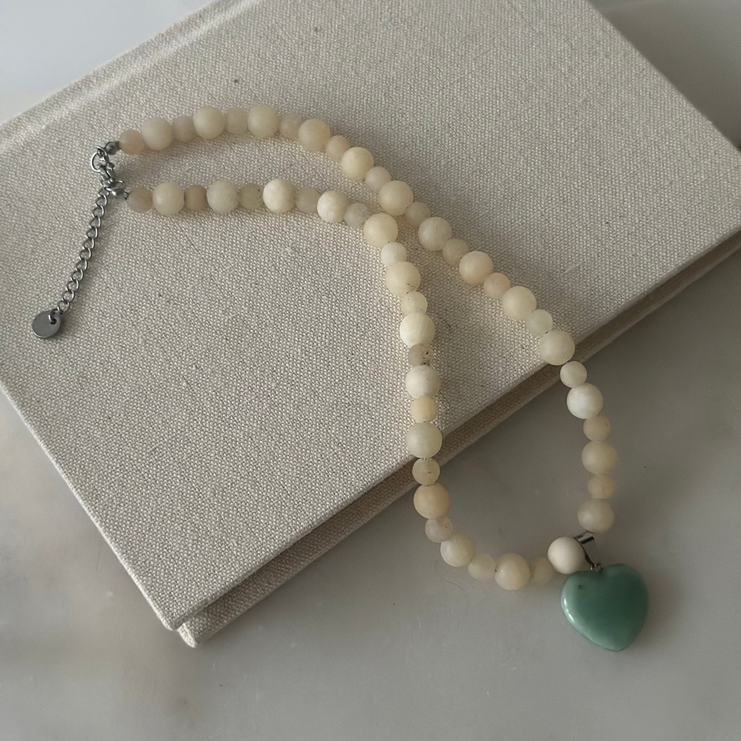 Naszyjnik Soul Balance to harmonijne połączenie waniliowego jadeitu i zawieszki w kształcie serca z zielonego awenturynu. Biżuteria z kamieni naturalnych, która wspiera spokój wewnętrzny i odwagę serca.