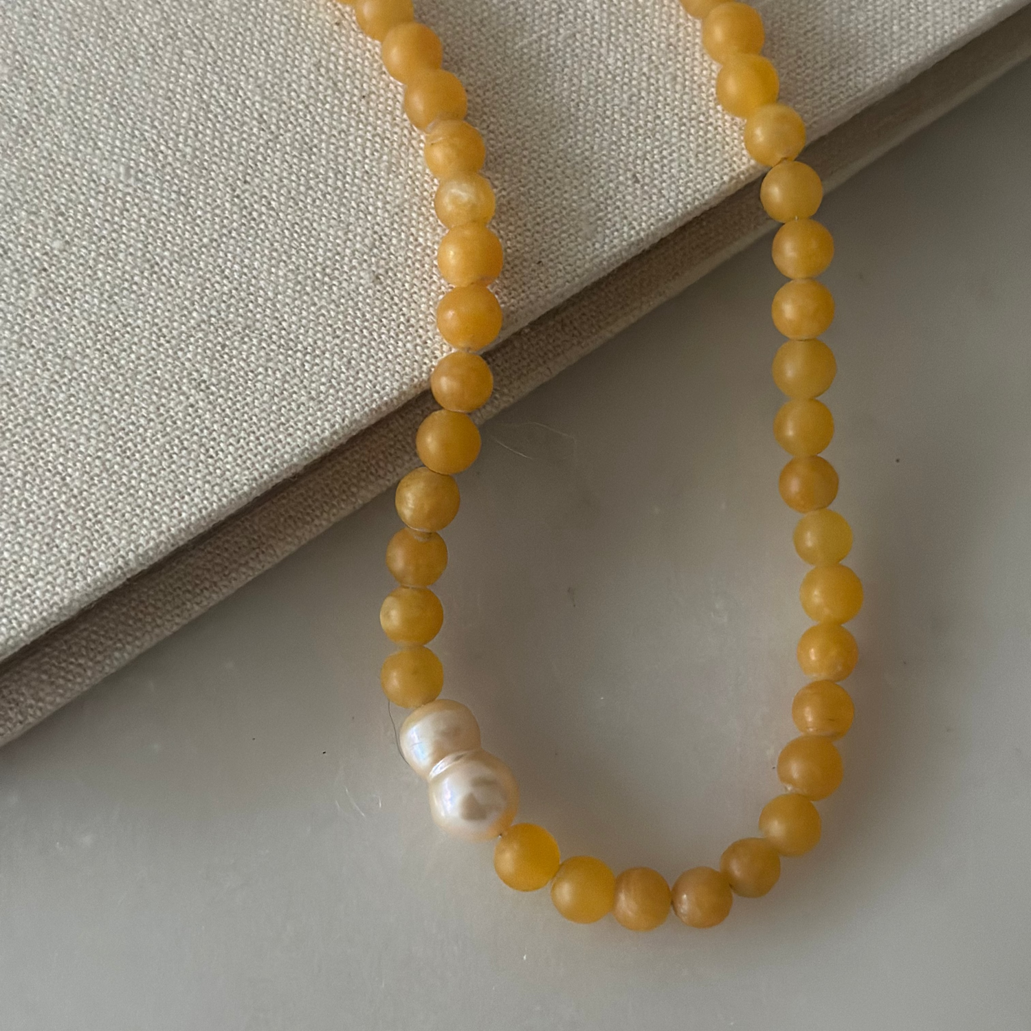 Sunlit Pearl to naszyjnik pełen ciepła i pozytywnej energii. Żółty matowy jadeit łączy się z unikalną nieregularną perłą, tworząc biżuterię, która rozświetla każdy dzień.