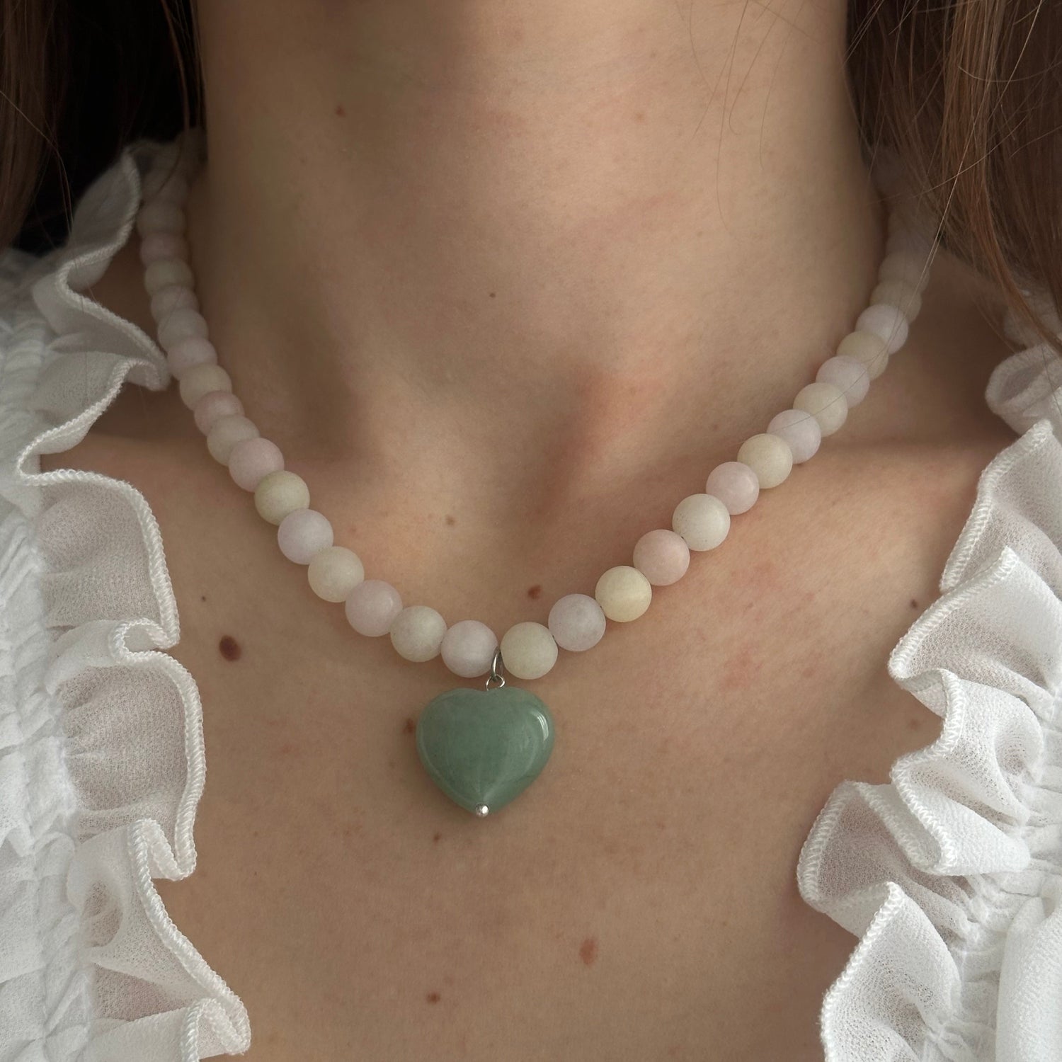 Naszyjnik Verâme łączy delikatność jadeitu morganitowego z sercem z awenturynu zielonego – symbolem harmonii i dobrych emocji. Lekki, kobiecy akcent z pozytywną energią na co dzień.