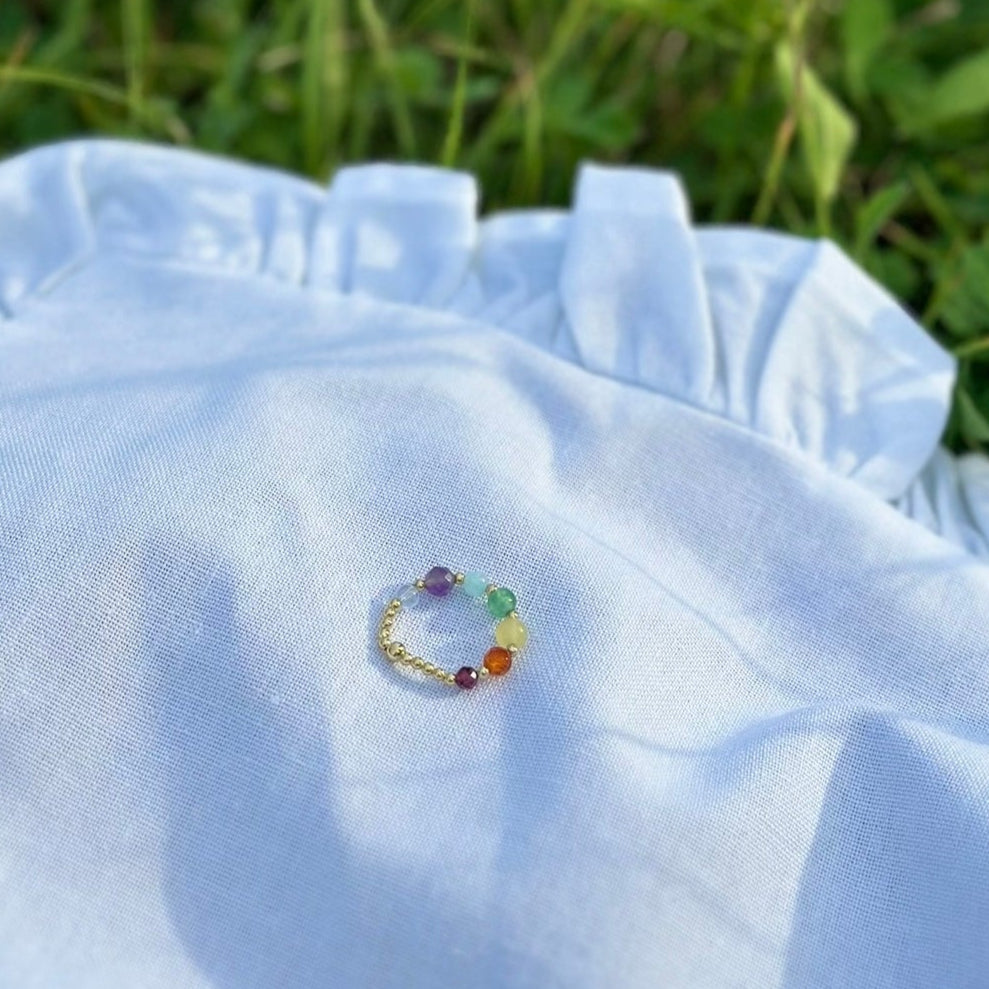Pierścionek „Harmonia Czakr” to coś więcej niż biżuteria — to małe, osobiste narzędzie energii, które możesz nosić zawsze przy sobie. Został stworzony z kamieni ściśle powiązanych z siedmioma czakrami: granatu, karneolu, jadeitu żółtego, awenturynu zielonego, jadeitu niebieskiego, ametystu i kryształu górskiego. Każdy kamień niesie w sobie energię, która wspiera i harmonizuje odpowiednią przestrzeń Twojego ciała i duszy.