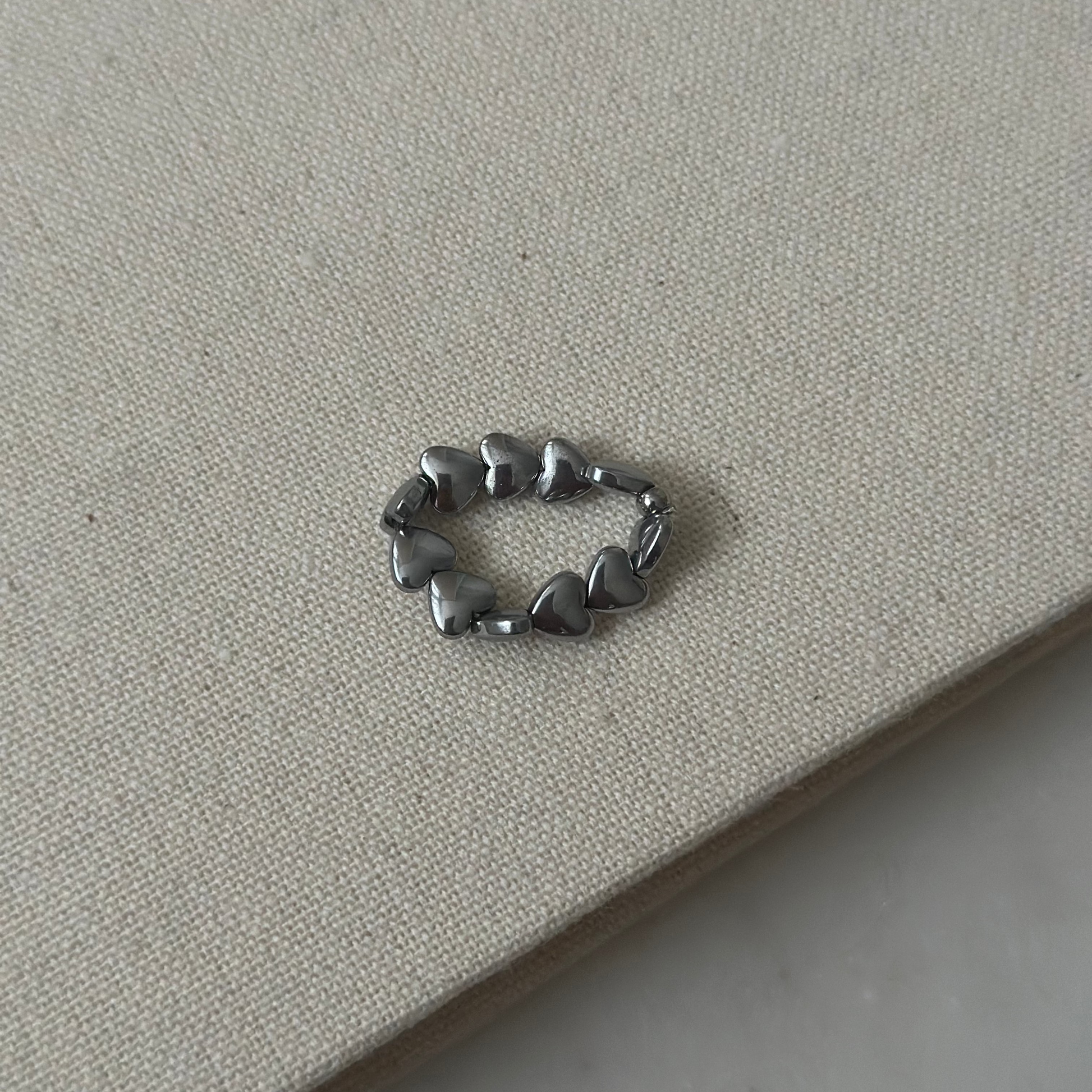 Pierścionek Lovéa to manifestacja miłości, ochrony i kobiecej siły, zaklęta w eleganckiej formie hematytowych serduszek. Każdy drobny element w kształcie serca tworzy harmonijny krąg, który otula palec niczym energetyczna obrączka, przypominająca o wewnętrznej stabilności i uczuciowej głębi.