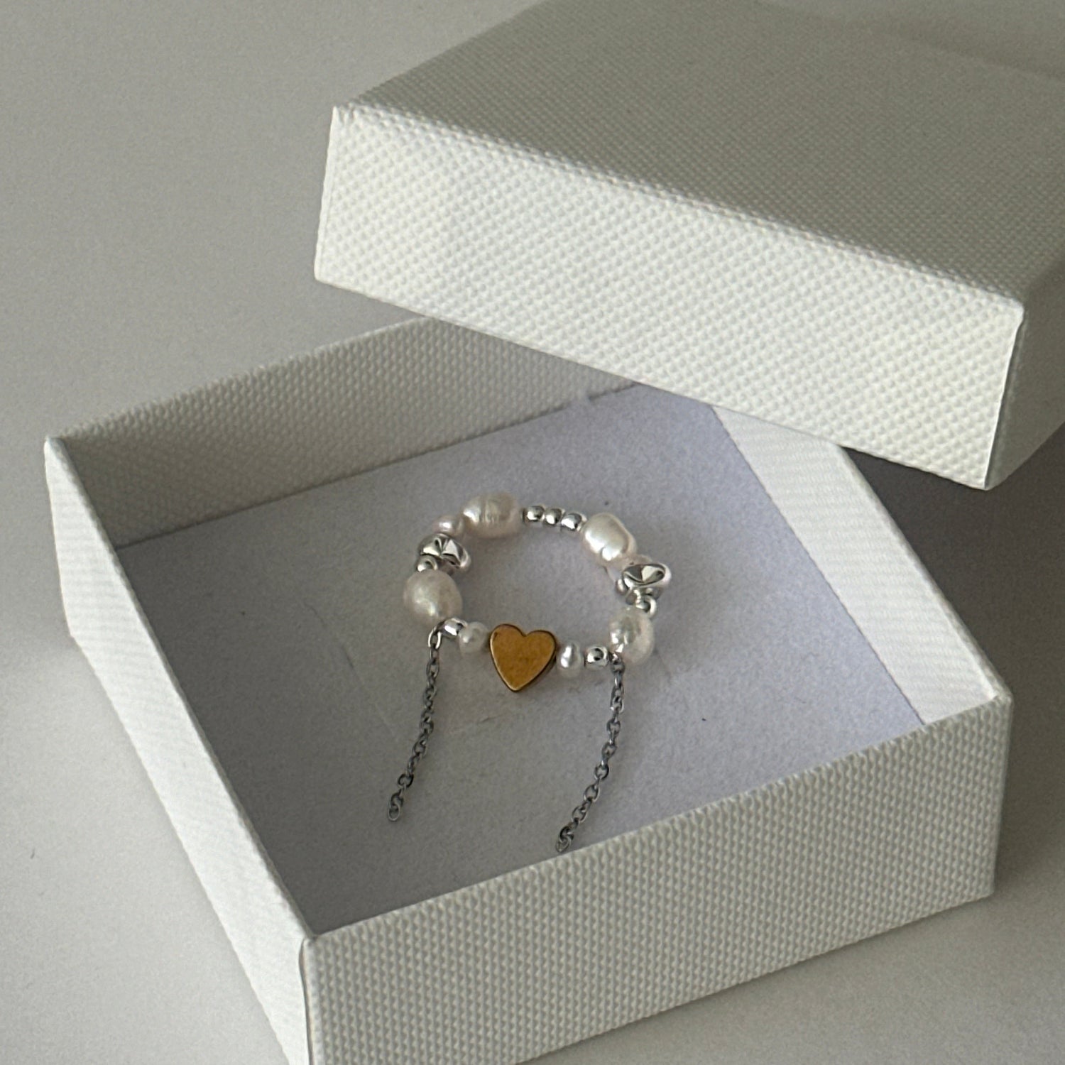 Delikatny pierścionek z perłami i serduszkiem z hematytu – subtelna elegancja i pozytywna energia w jednej formie.