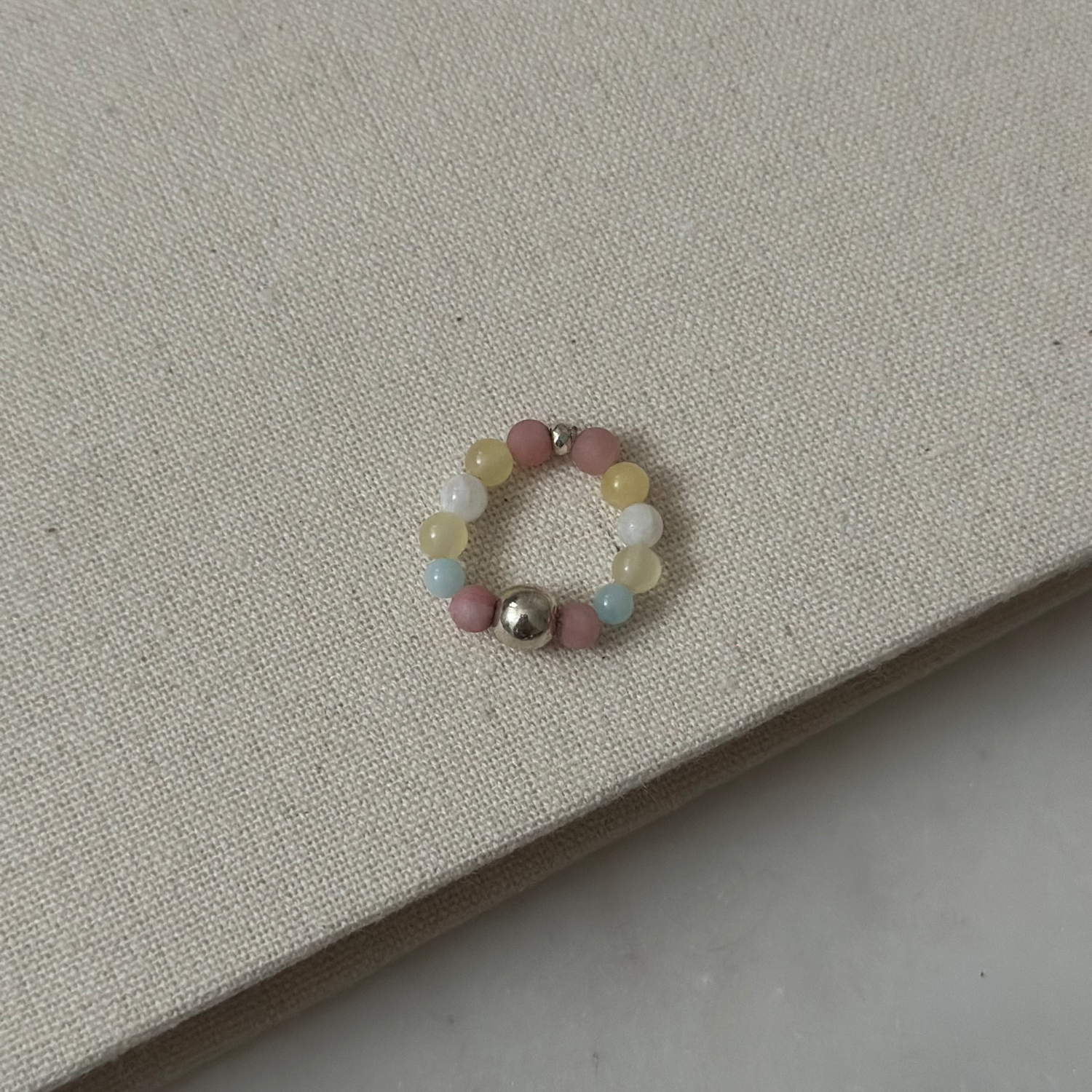 Pierścionek Soléa to barwna kompozycja naturalnych kamieni: różowego agatu, jadeitu w odcieniach błękitu i żółci, kamienia księżycowego oraz hematytu. Lekki, stylowy i wyjątkowy – idealny do wyrażania siebie poprzez subtelną, ale wyrazistą biżuterię.