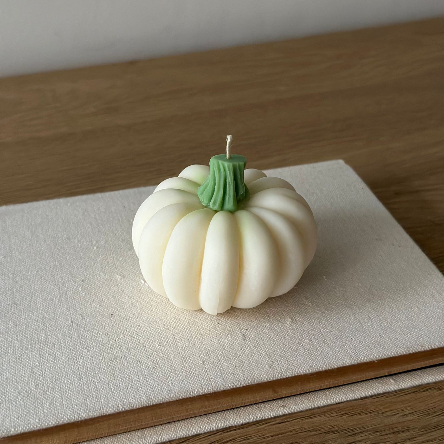 Jesienna świeca sojowa Pumpkin Classic w kształcie klasycznej dyni. Stylowa dekoracja i nastrojowe światło na długie wieczory — z czystym spalaniem, przyjazna dla domu i idealna na sezon jesień w kolorze białym.