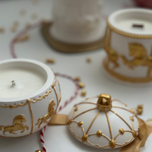 Bombka Świąteczna z Konikami to świeca sojowa w gipsowym pojemniczku w kształcie klasycznej świątecznej bombki, udekorowana miniaturowymi konikami. Ręcznie wykonana z naturalnego wosku sojowego, pali się równomiernie i czysto. Każdy detal został starannie wykonany, tworząc magiczną, zimową scenę, która wprowadza przytulny nastrój do wnętrza. „Bombka Świąteczna z Konikami” to wyjątkowy prezent lub świąteczny upominek, który zachwyca elegancją, rzemieślniczą precyzją i bajkowym urokiem.