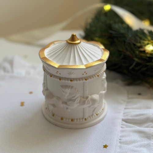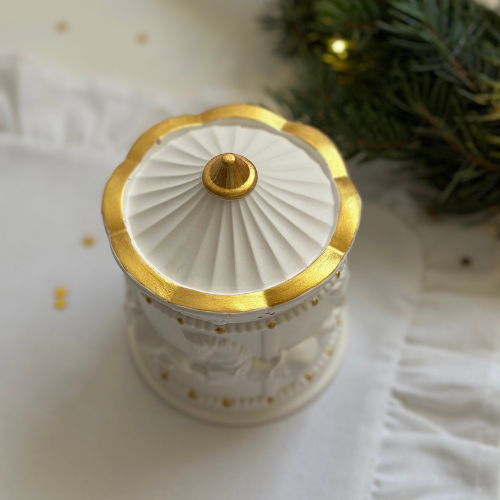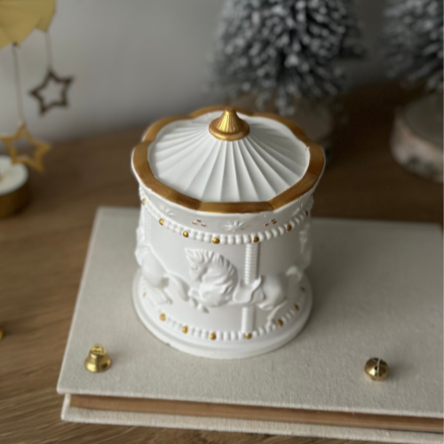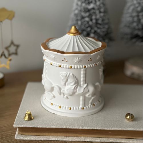 Karuzela – dekoracyjna świeca sojowa inspirowana świąteczną karuzelą z konikami. Ręcznie wykonana, pełna uroku i detali, wprowadza do wnętrza odrobinę magii i nostalgii. Idealna także na prezent.