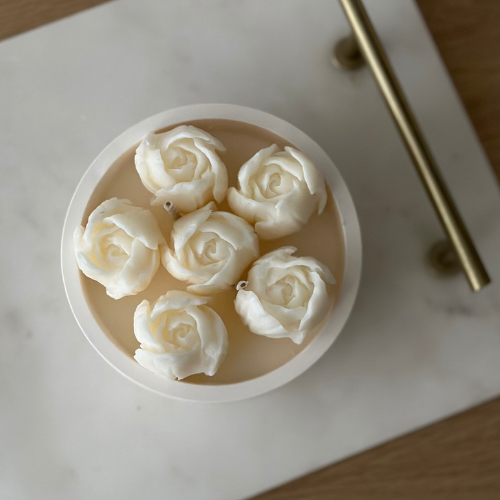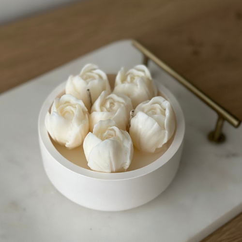 Świeca sojowa dekoracyjna Tulipany to ręcznie wykonana świeca z naturalnego wosku sojowego, ozdobiona białymi tulipanami z wosku. Subtelna dekoracja wnętrza i elegancki pomysł na prezent.