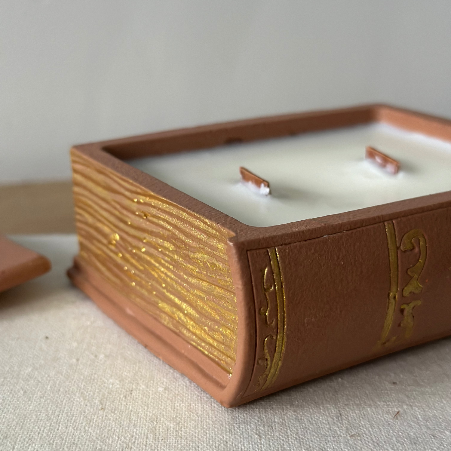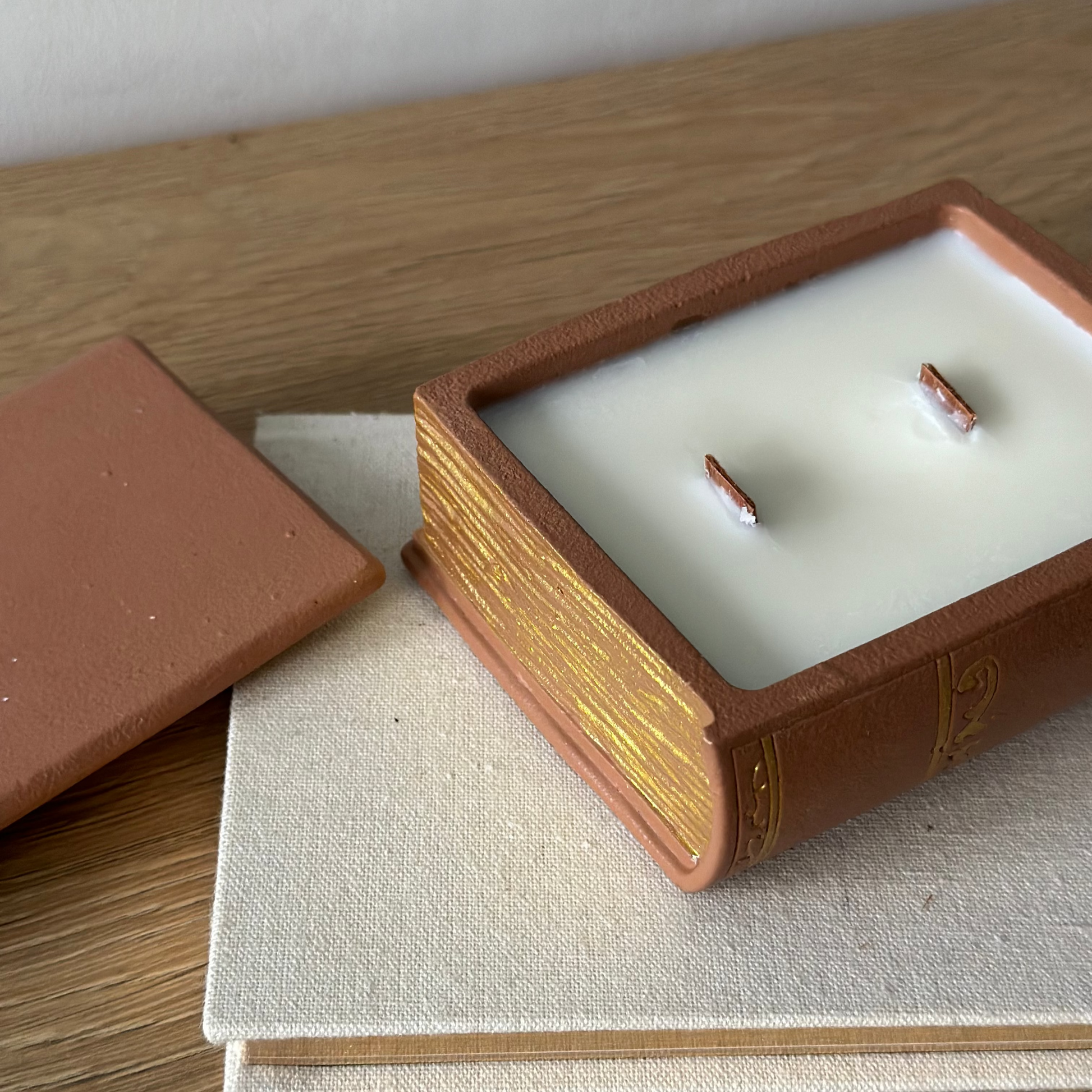 Ręcznie robiona świeca sojowa w kształcie książki ze złoceniem – dostępna z drewnianym lub bawełnianym knotem.