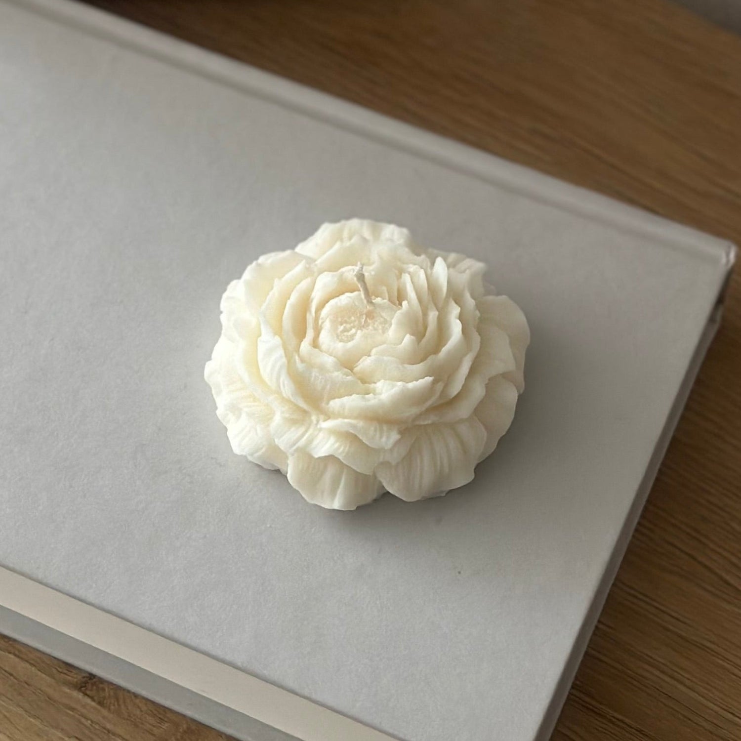 Świeca sojowa w kształcie kwiatu piwonii – elegancka dekoracja wnętrza i nastrojowe światło na długie wieczory.