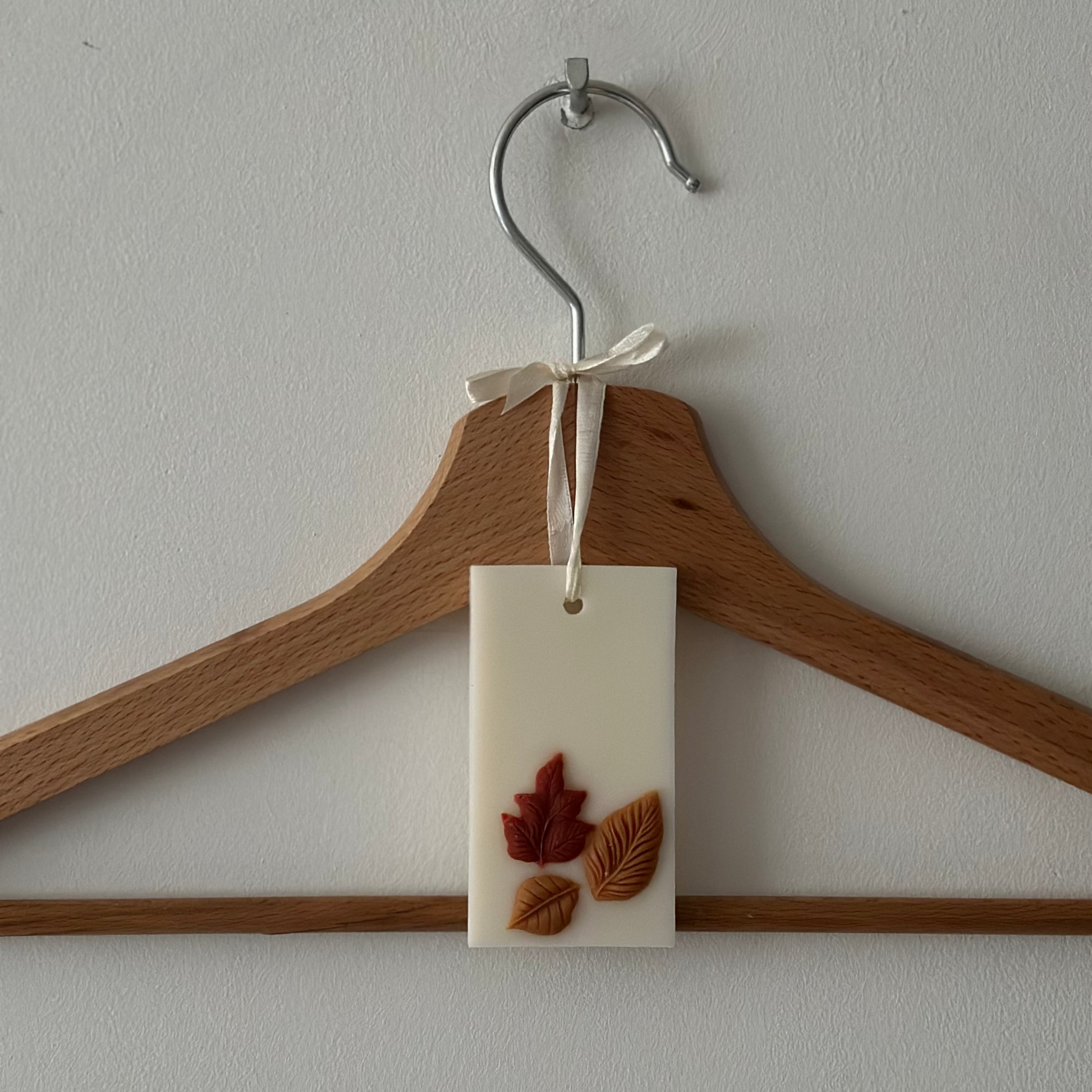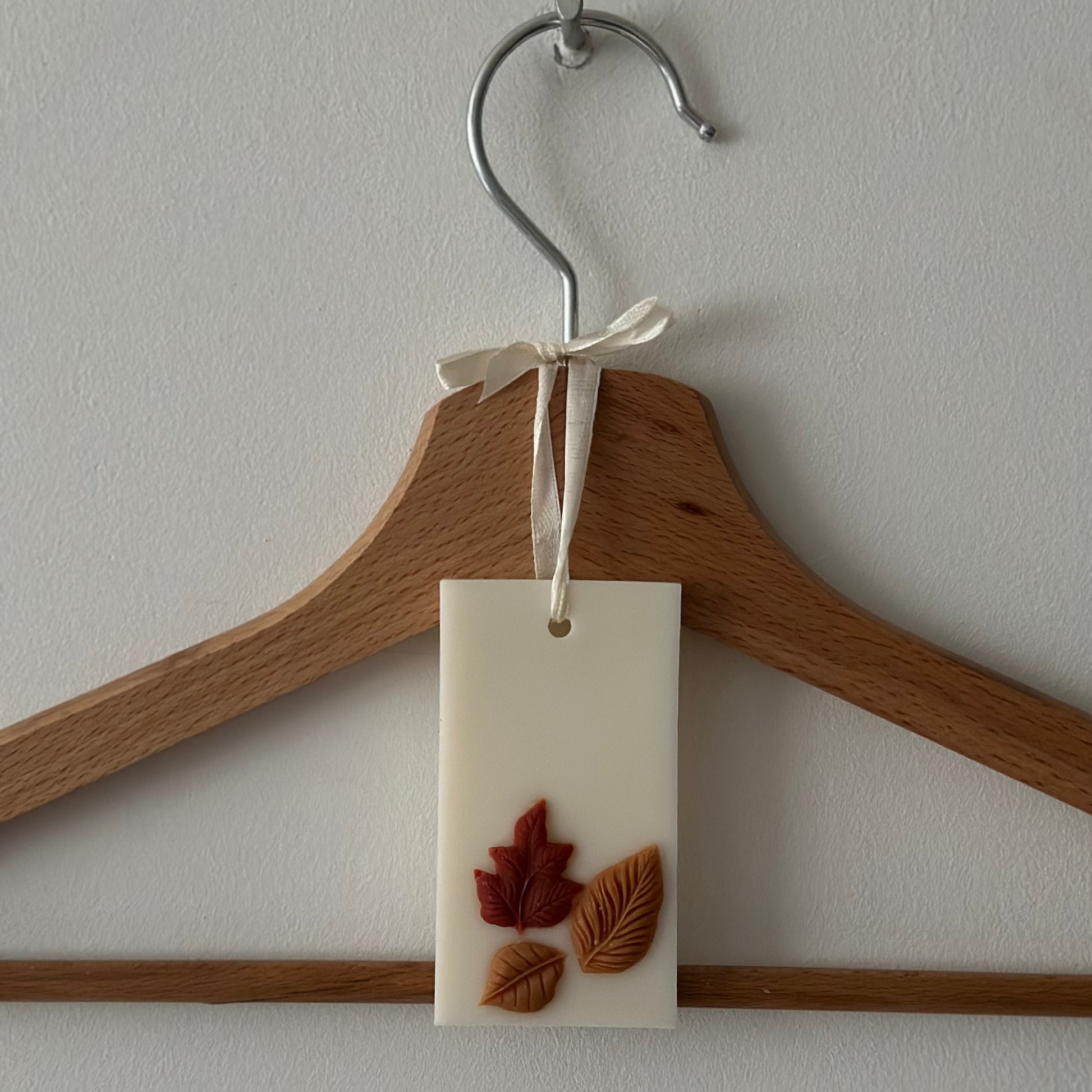 Zawieszka zapachowa do szafy z naturalnego wosku sojowego, ozdobiona jesiennymi liśćmi. Nadaje ubraniom świeży aromat i stanowi piękną dekorację.