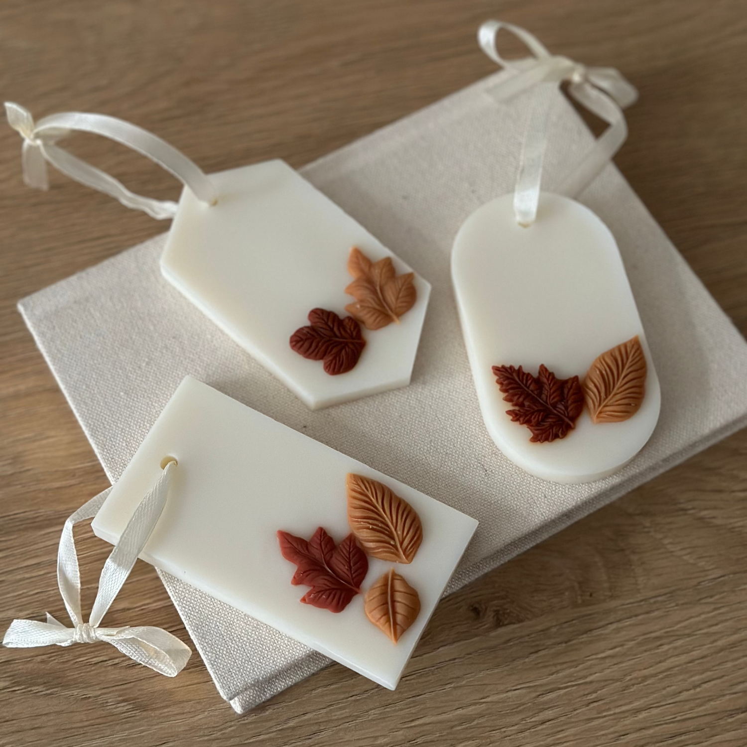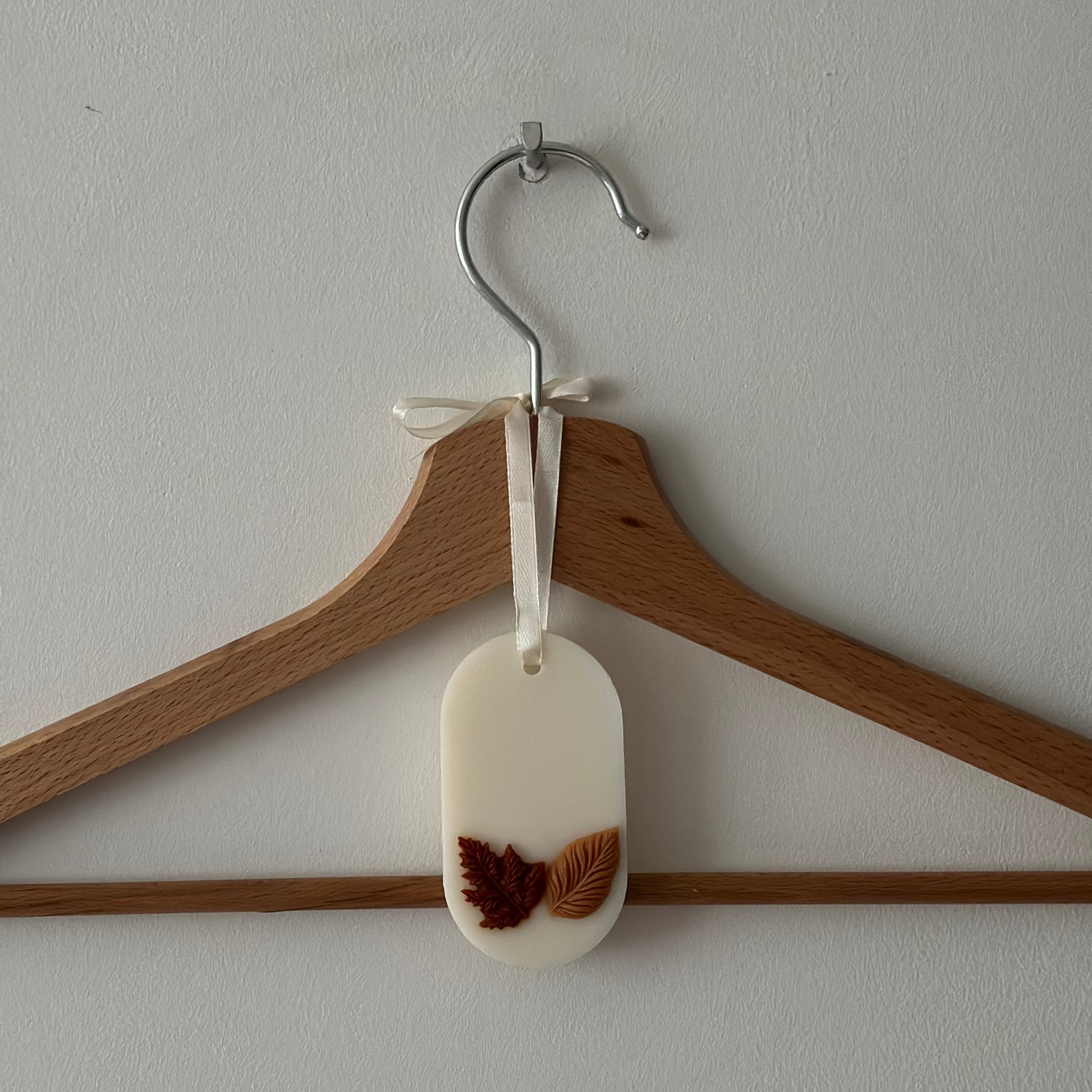 Zawieszka zapachowa do szafy z naturalnego wosku sojowego, ozdobiona jesiennymi liśćmi. Nadaje ubraniom świeży aromat i stanowi piękną dekorację.