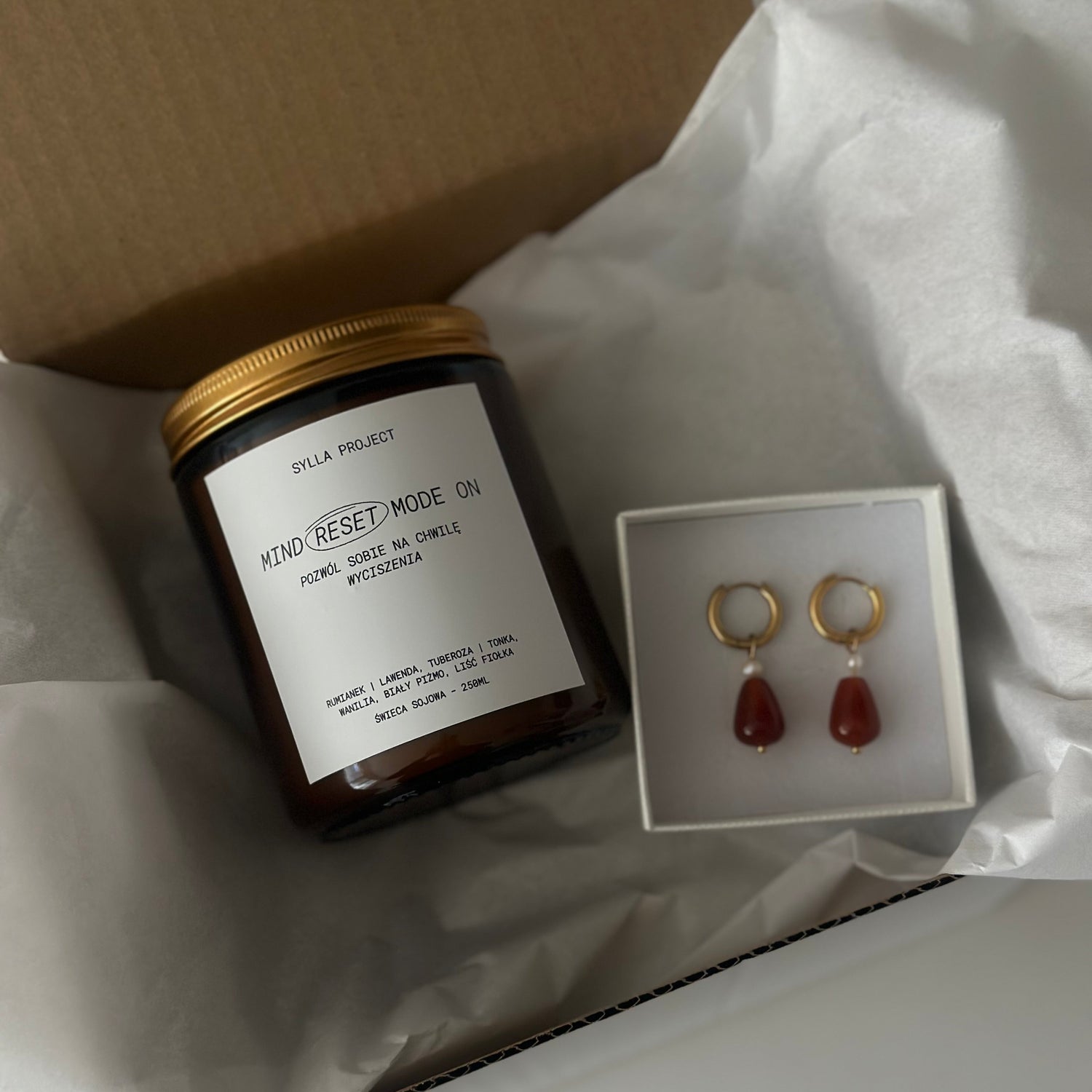 Zestaw, który łączy relaks i subtelną elegancję: świeczka Mind Reset Mode On i kolczyki 2w1 Pearl & Agate z perłą i agatem karneolowym. Idealny na prezent lub jako chwila tylko dla siebie.