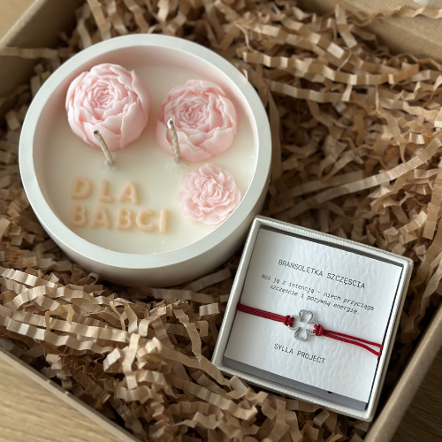 Zestaw Prezentowy „Piwonie dla Babci” – Świeca Sojowa + Bransoletka Szczęścia z Koniczynką
