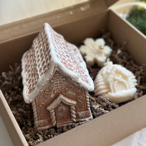 Zestaw prezentowy świąteczny zawierający świecę Domek Piernikowy, świecę Domek w Lesie i Śnieżynkę. Zapakowany w pudełko prezentowe. Idealny do dekoracji domu lub jako gotowy prezent na święta.