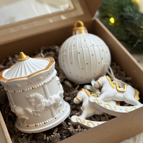 Elegancki zestaw świąteczny z świecą karuzelą z konikami, bombką świąteczną i dwiema zawieszkami konik. Zapakowany w pudełko prezentowe. Idealny do dekoracji domu lub jako gotowy prezent na święta.