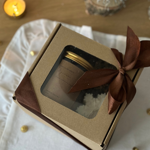 Świąteczny zestaw prezentowy zawierający świecę w brązowym szkle 250 ml oraz świecę Śnieżynkę. Zapakowany w pudełko prezentowe. Idealny do dekoracji domu lub jako gotowy prezent na święta.