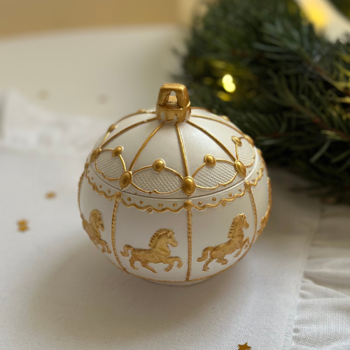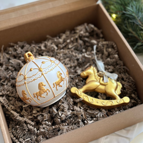 Zestaw prezentowy świąteczny łączy świecę w kształcie bombki świątecznej z konikami & zawieszką Konik w kolorze złotym, tworząc elegancką i wyjątkową dekorację świąteczną.
