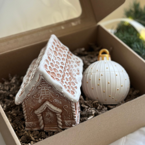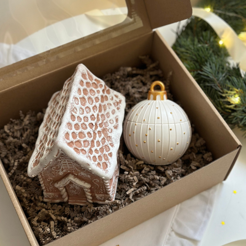 Zestaw prezentowy świąteczny zawiera świecę w kształcie domku piernikowego i bombkę świąteczną. Zapakowany w eleganckie pudełko prezentowe. Idealny do dekoracji domu lub jako gotowy prezent na święta.