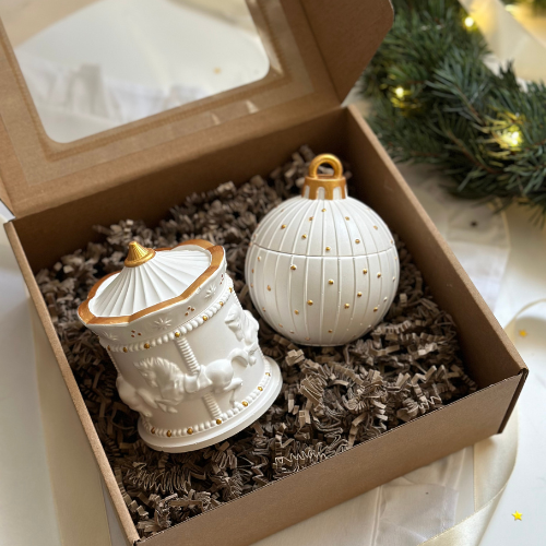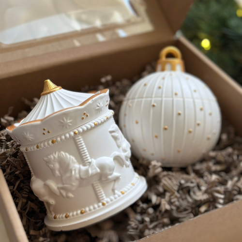 Zestaw prezentowy świąteczny zawiera świecę karuzelę i bombkę świąteczną. Zapakowany w eleganckie pudełko prezentowym. Idealny do dekoracji domu lub jako gotowy prezent na święta.