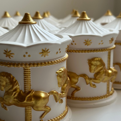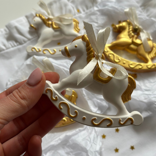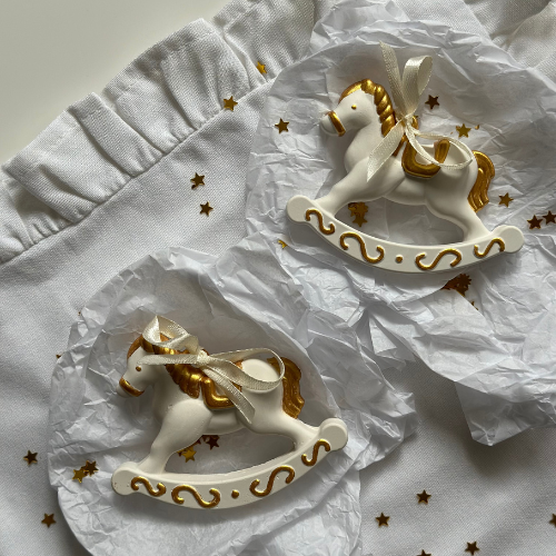 Świeca karuzela z konikami zachwyca bogactwem detali i wyjątkową formą, stanowiąc efektowną ozdobę, która przyciąga wzrok i dodaje wnętrzu bajkowego charakteru. Dwie zawieszki konik stanowią idealne uzupełnienie zestawu — sprawdzą się doskonale na choince, stroiku lub jako dekoracyjny akcent do prezentów.