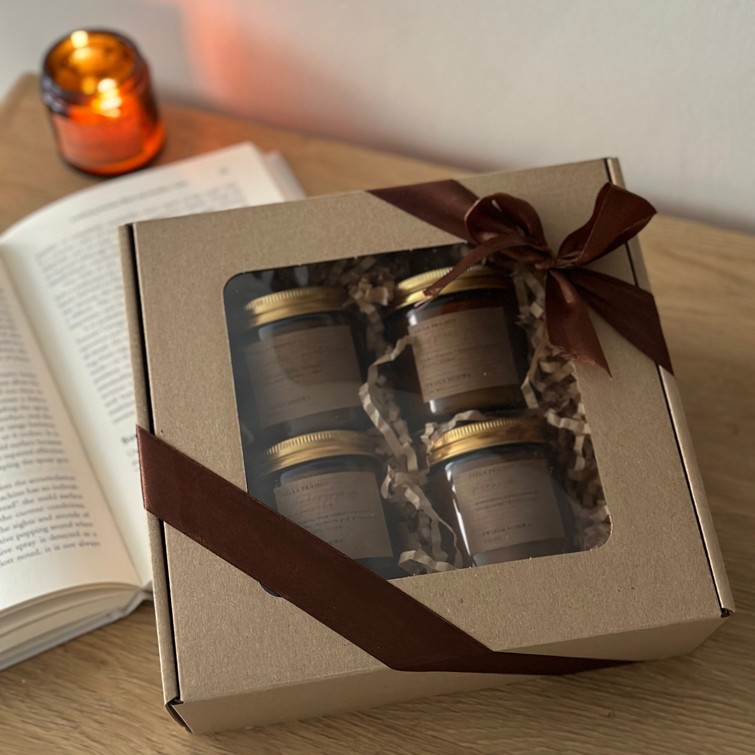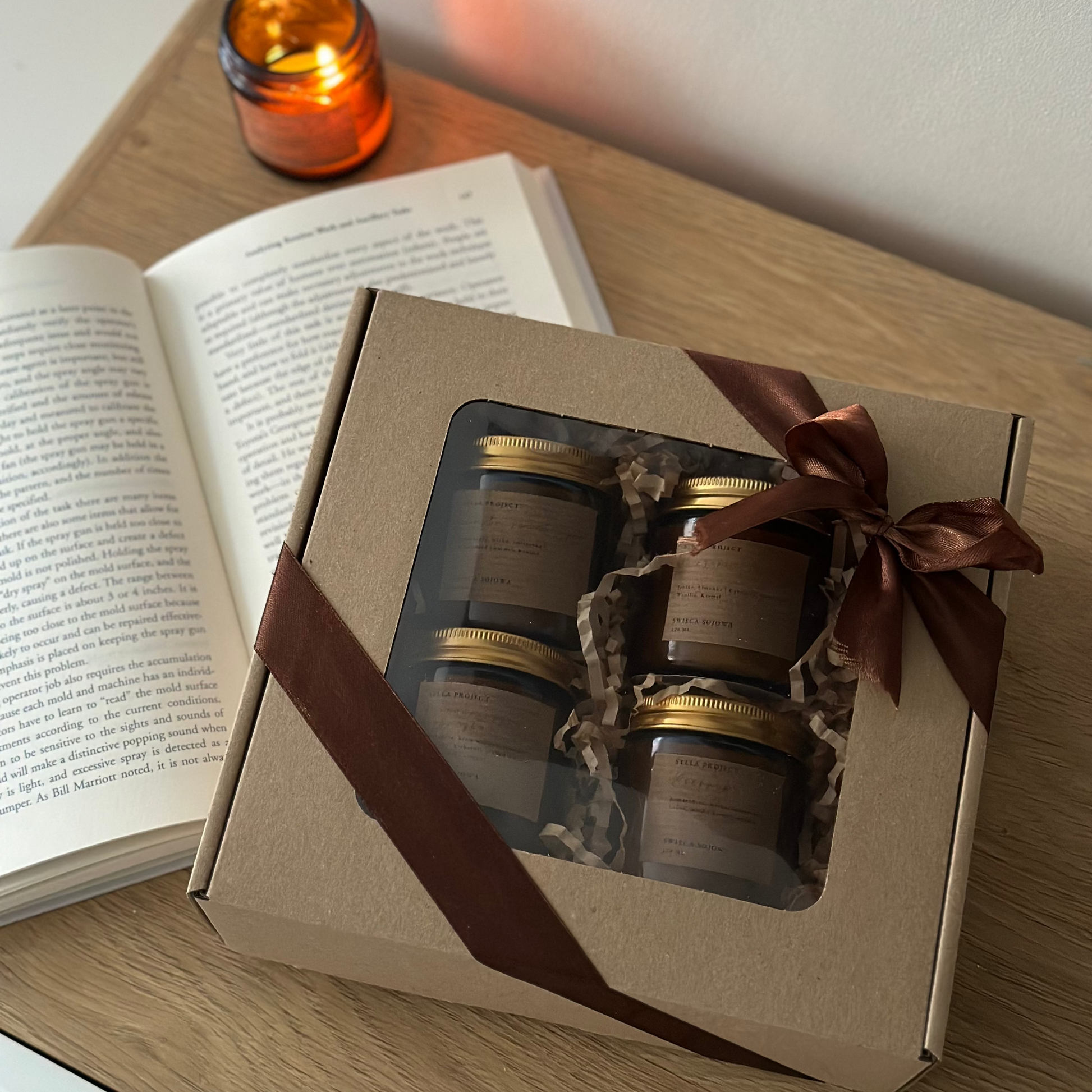 Zestaw Prezentowy Świec Sojowych – Aromat Zimy to 4 świece 120 ml w zapachach zimowych: Korzenna Zima, Mandarynkowa Babeczka, Piernik i Ciasto Świąteczne. Idealny zestaw na prezent lub do stworzenia przytulnej, świątecznej atmosfery w domu.