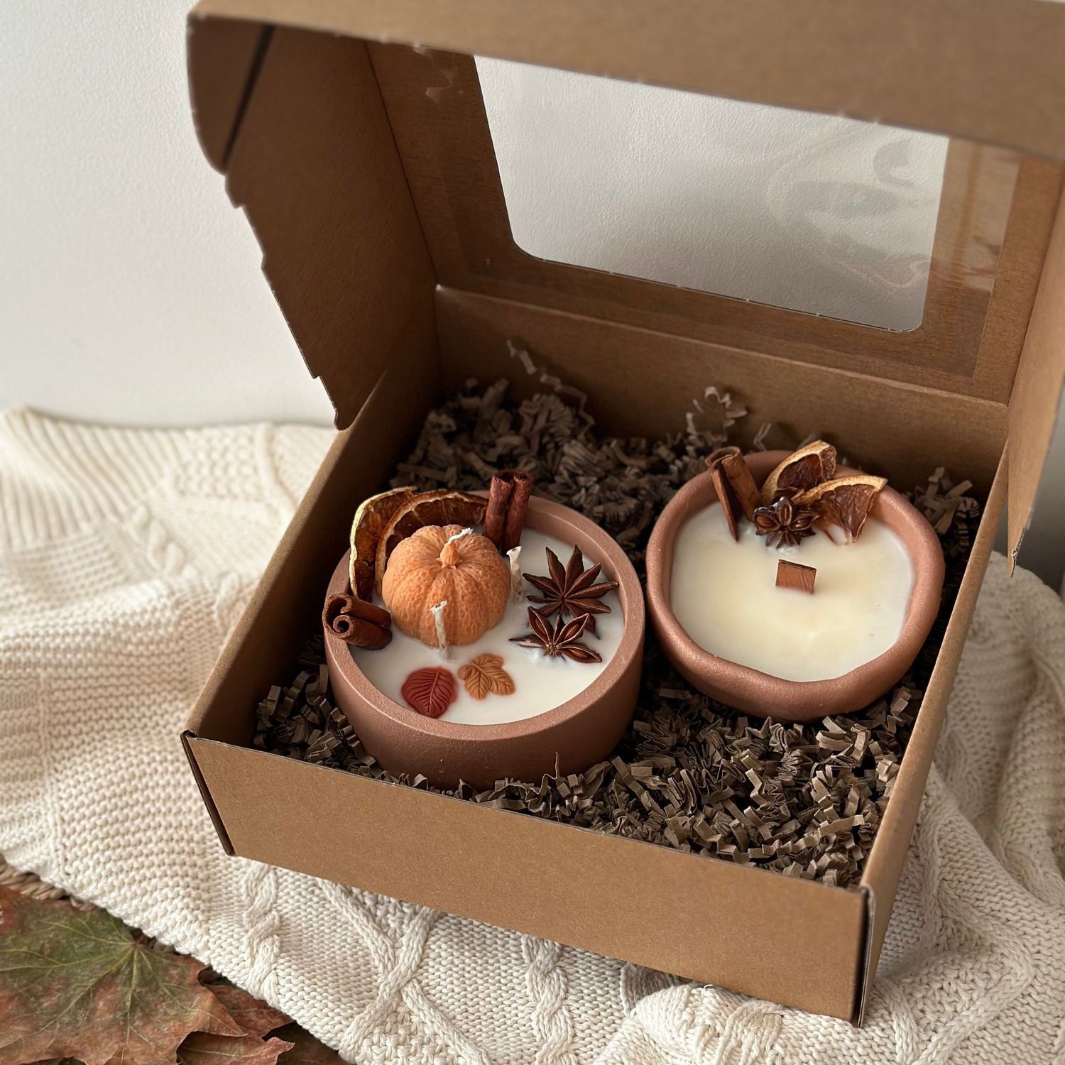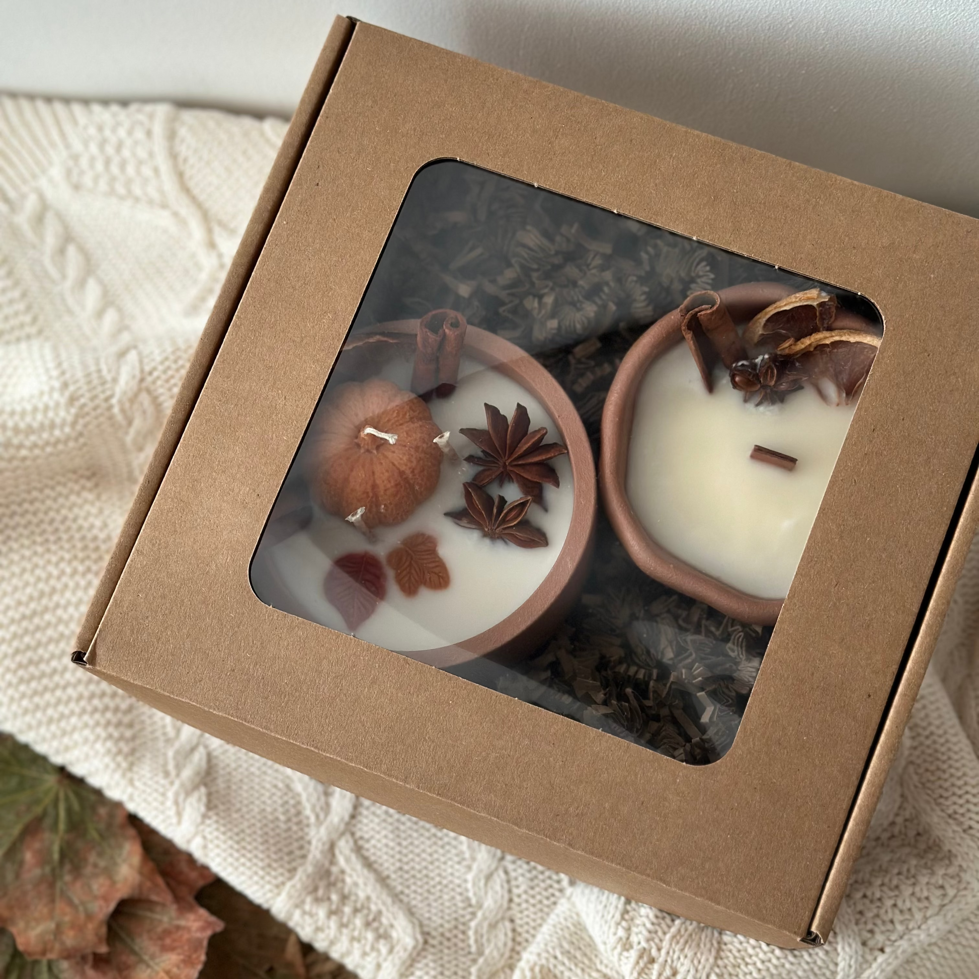 Zestaw 2 świec sojowych „Domowe Ciepło” i „Dynia, Liście i Przyprawy” 🍂