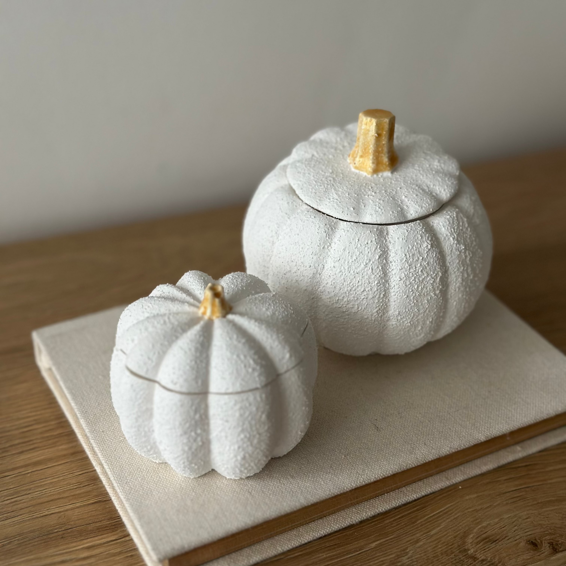 Zestaw świec sojowych w gipsowych pojemnikach w kształcie dyni – mała i duża świeca tworzą spójną, jesienną dekorację. Ręcznie wykonane, naturalny wosk sojowy, idealne na długie, przytulne wieczory lub jako elegancki prezent.
