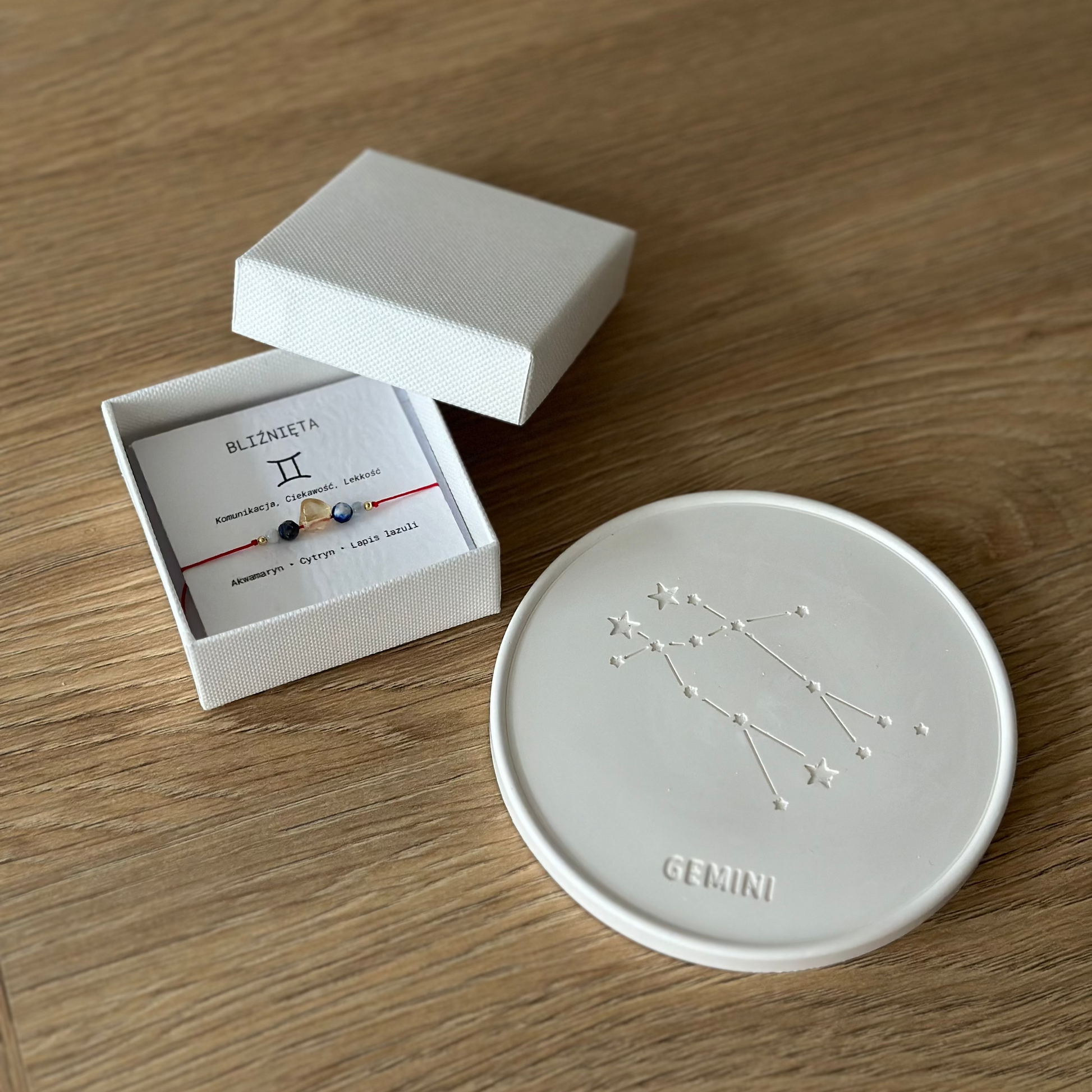 Bransoletka z naturalnych kamieni wspierających komunikację i kreatywność oraz elegancka, gipsowa podstawka z motywem Bliźniąt. Idealny zestaw dla osób spod znaku Bliźniąt, które cenią jasność umysłu i swobodę wyrażania siebie.