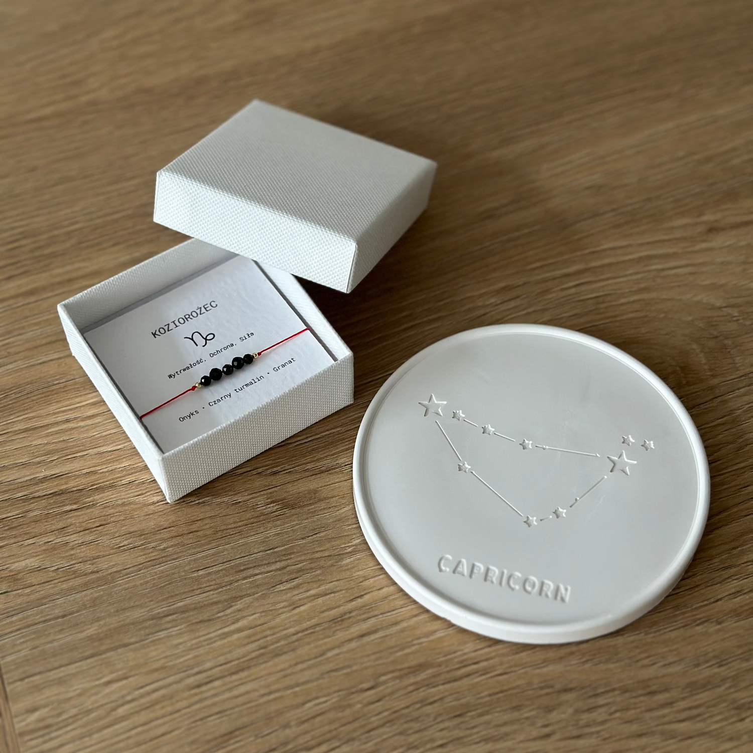 Bransoletka z naturalnych kamieni dodających siły i ochrony oraz elegancka, gipsowa podstawka z motywem Koziorożca. Doskonały zestaw dla osób spod znaku Koziorożca, które cenią wytrwałość, stabilność i determinację.