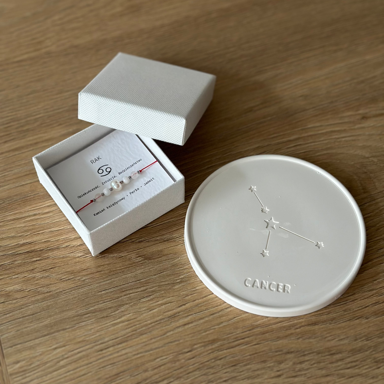 Bransoletka z naturalnych kamieni wspierających harmonię emocjonalną i intuicję oraz elegancka, gipsowa podstawka z motywem Raka. Doskonały zestaw dla osób spod znaku Raka, które cenią spokój, wrażliwość i duchową równowagę.