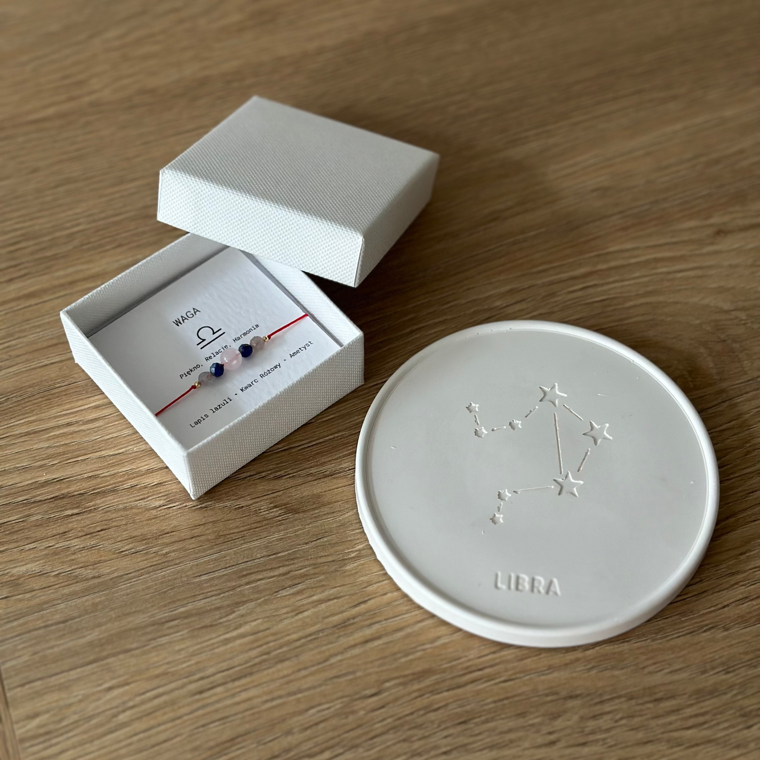 Bransoletka z naturalnych kamieni wspierających miłość i równowagę oraz elegancka, gipsowa podstawka z motywem Wagi. Doskonały zestaw dla osób spod znaku Wagi, które cenią harmonię, inspirację i pewność siebie.